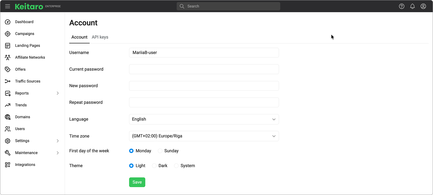- Theme. This function changes the interface theme.