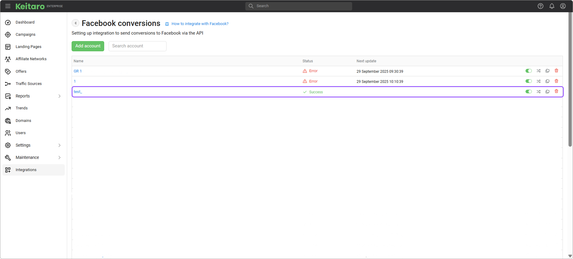- Status. The status of the added integration. Please note that creating a Facebook integration without adding a campaign will show an error.