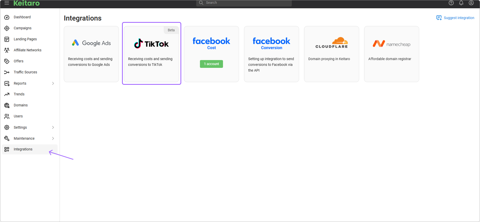 The integration allows you to transfer campaign costs from TikTok Ads to Keitaro and send conversions to optimize ad campaigns on the source side.
