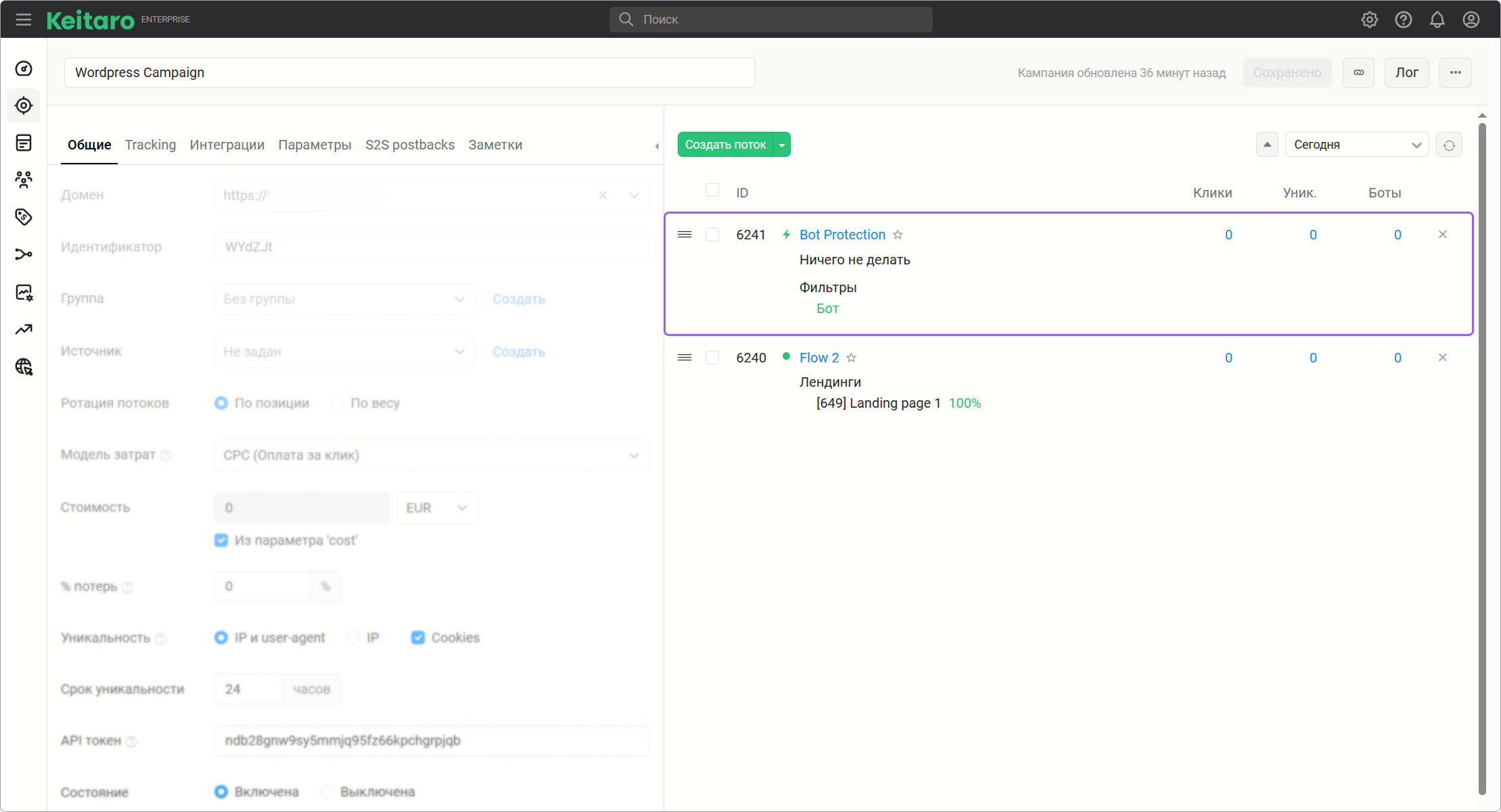 - Создайте кампанию в Keitaro.