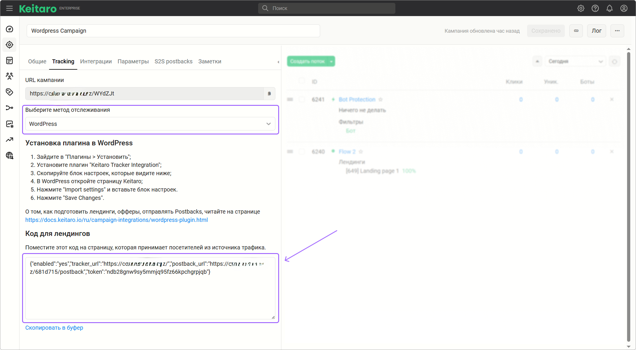 Откройте кампанию, вкладку Tracking. Выберите интеграцию «WordPress». Скопируйте код настроек из трекера (CTRL+C):