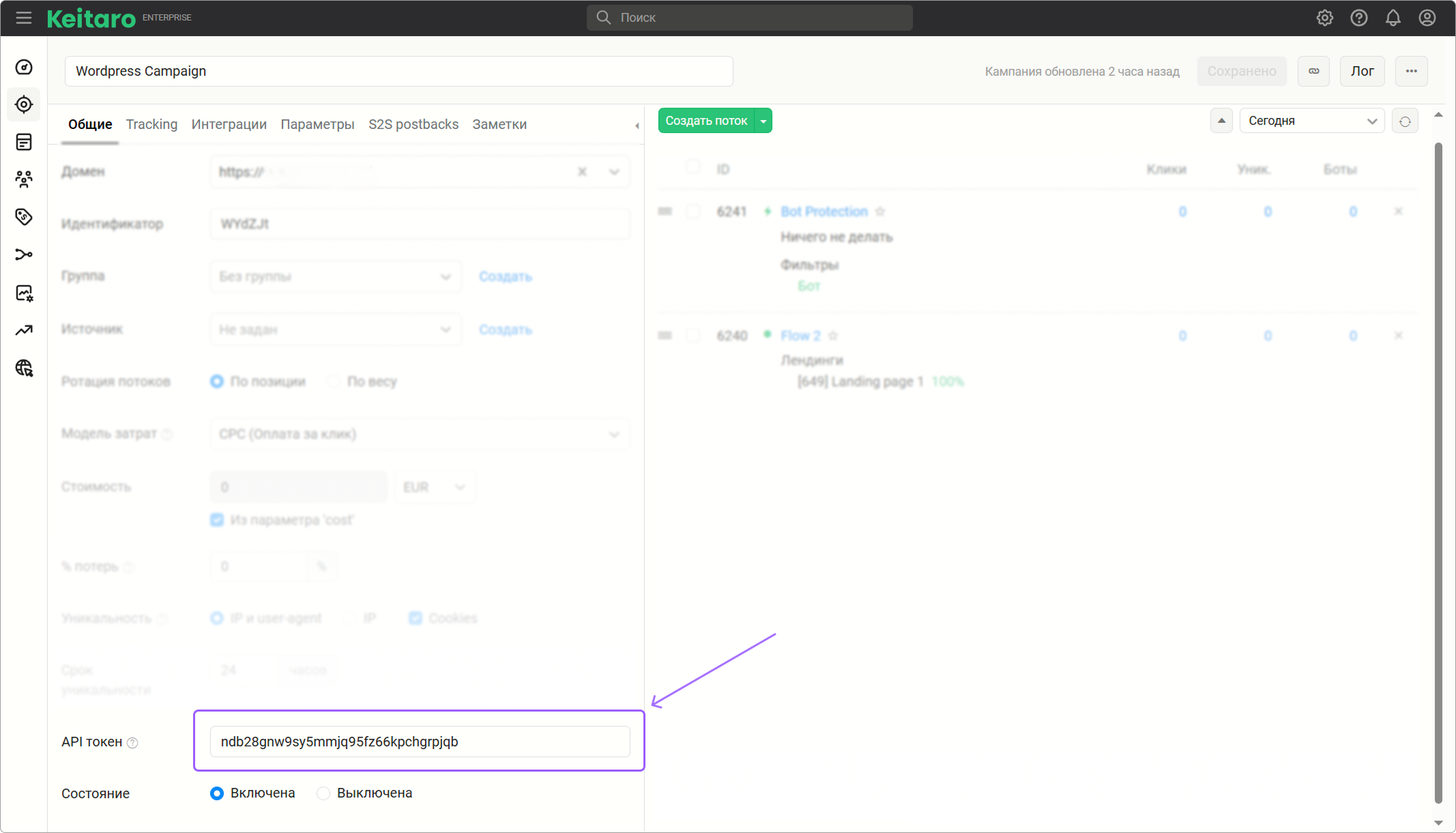 Токен берется в настройках кампании: