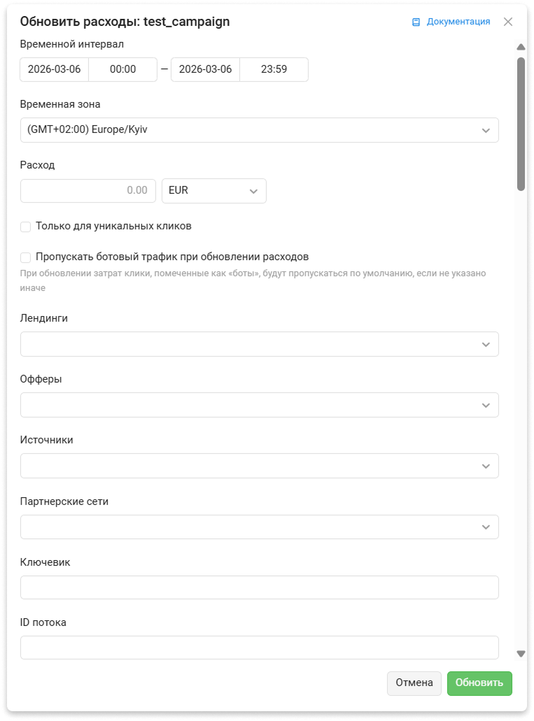 - Обновляются расходы у конверсий, которые связаны с данными кликами.
