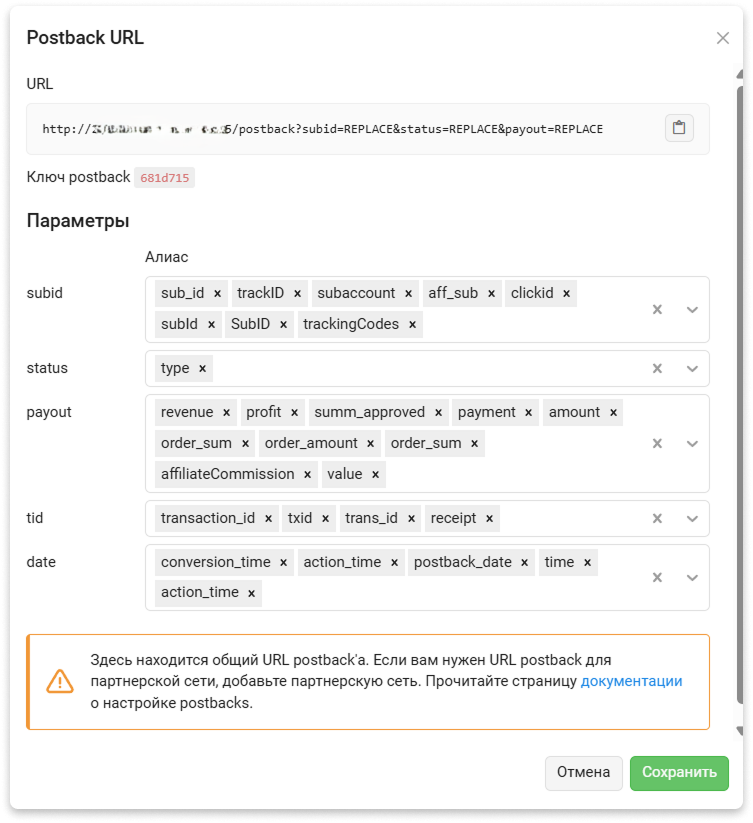 Получение Postback URL для партнерской сети описано в разделе Postback партнерской сети.