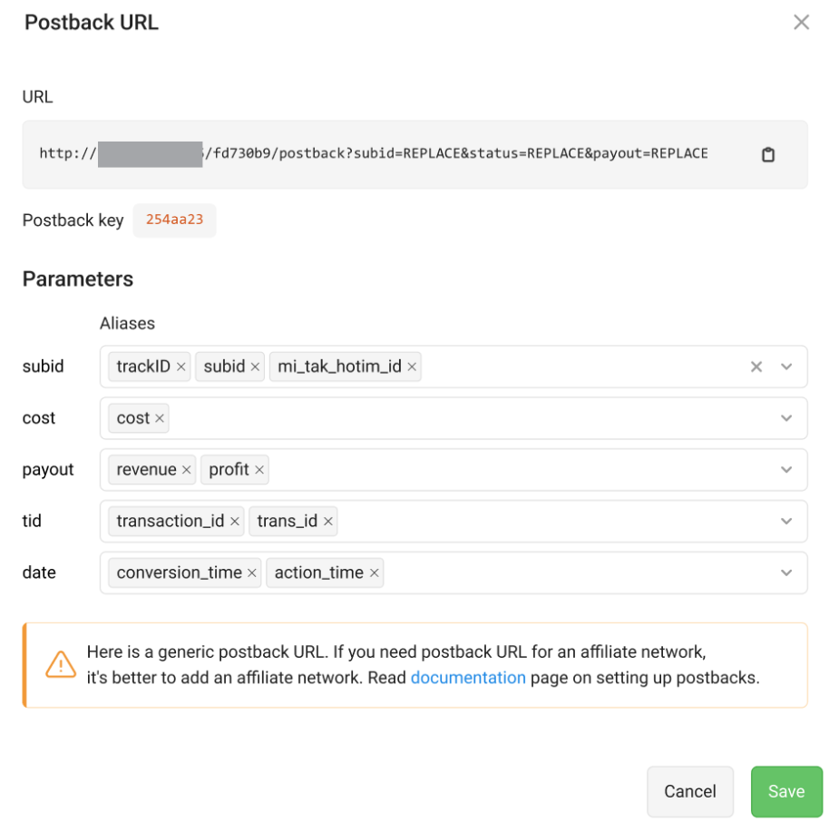 В том случае, когда партнерская сеть отправляет параметр клика трекера только в определенном параметре, отличающемся от subid, необходимо вписать имя такого параметра в окне, чтобы трекер корректно обработал Postback. Доступна настройка и других имен параметров по аналогии.