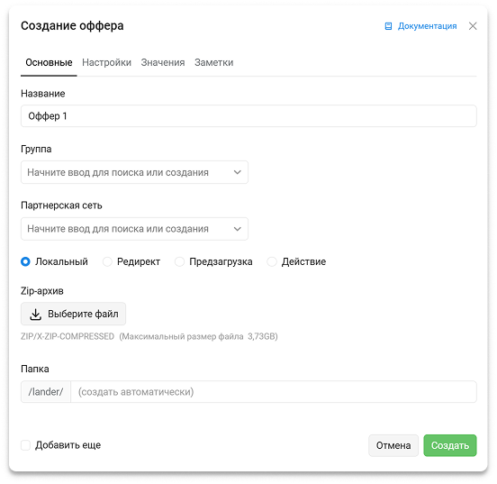 Локальный оффер — возможность загрузить ZIP-архив с оффером в трекер. Открытие оффера осуществляется без редиректа.