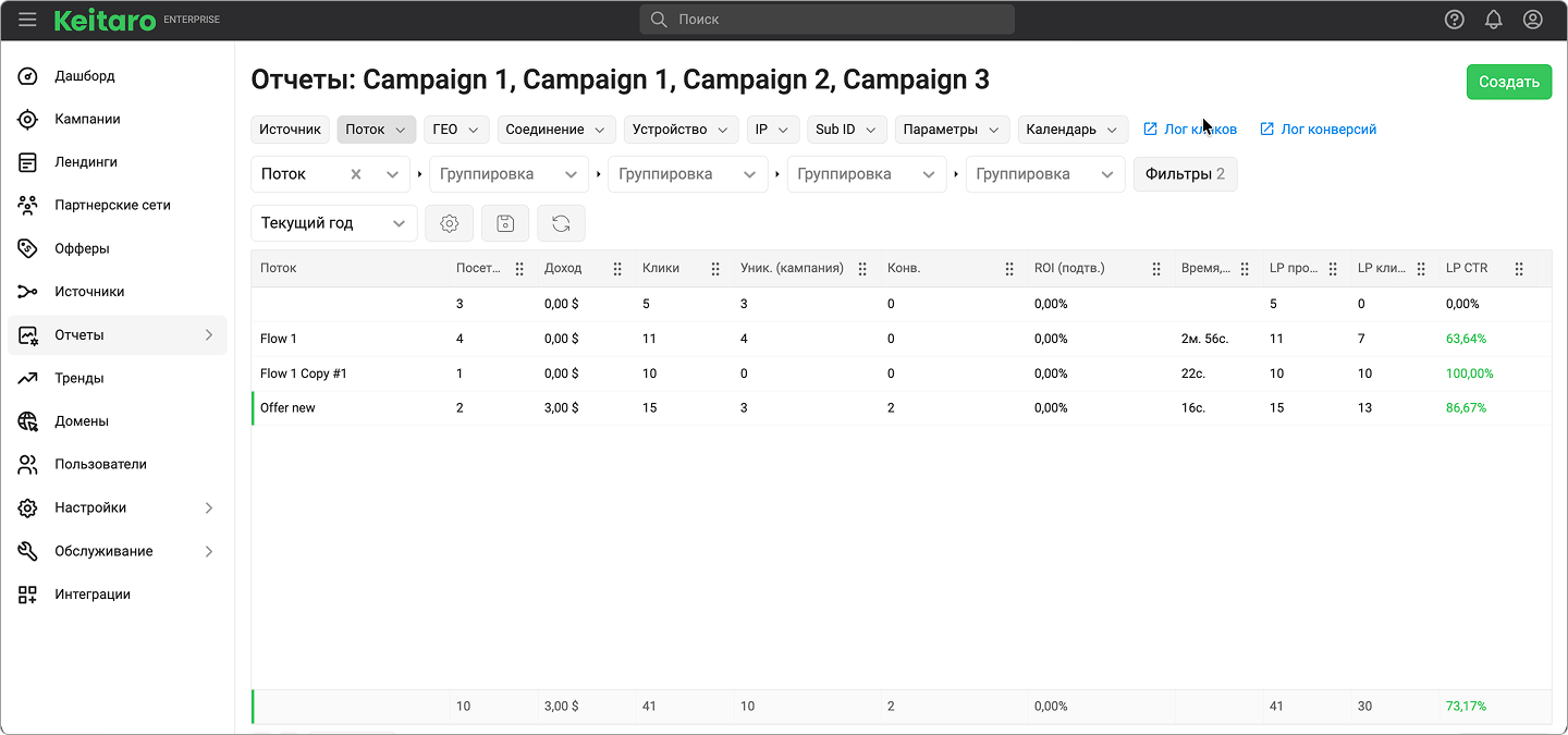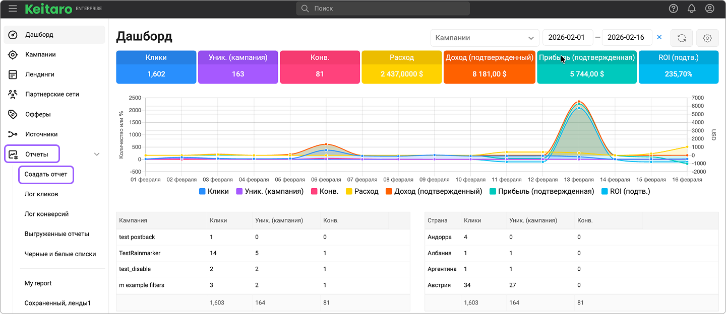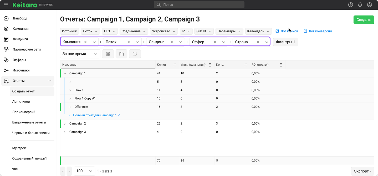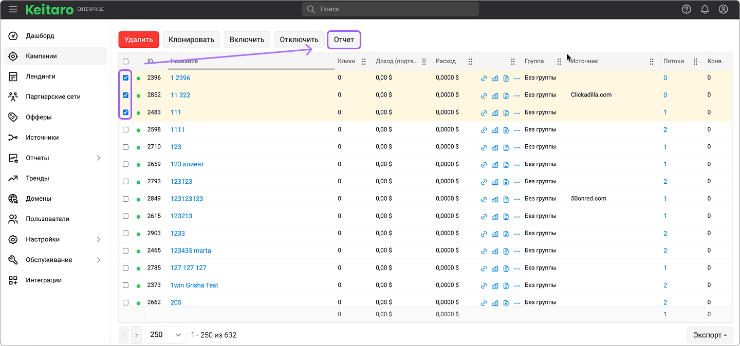 - Перейдите в раздел "Кампании", отметьте галочками нужные кампании и выберите "Отчет":