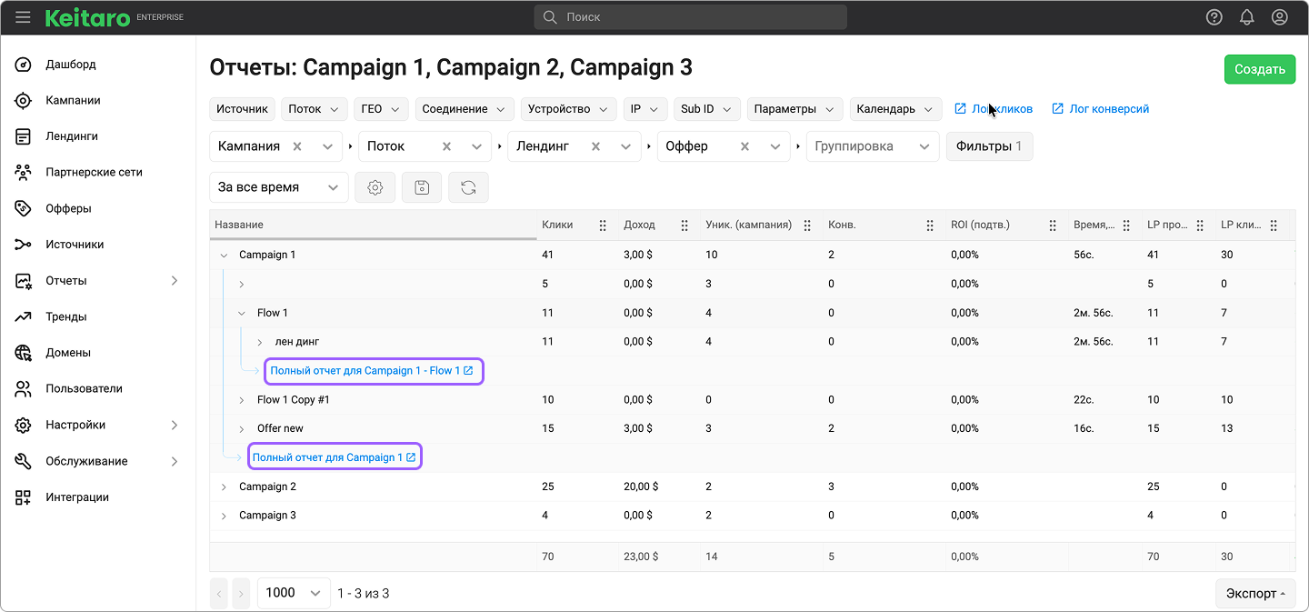 На каждом уровне древовидного отчета предоставляется возможность кликнуть на ссылку и открыть подробный отчет по конкретному уровню для более детального и глубокого анализа статистики.