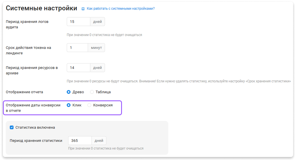 Как включить отчеты по дате конверсии: Настройки - Системные - Отображение даты конверсии в отчете - Конверсия.