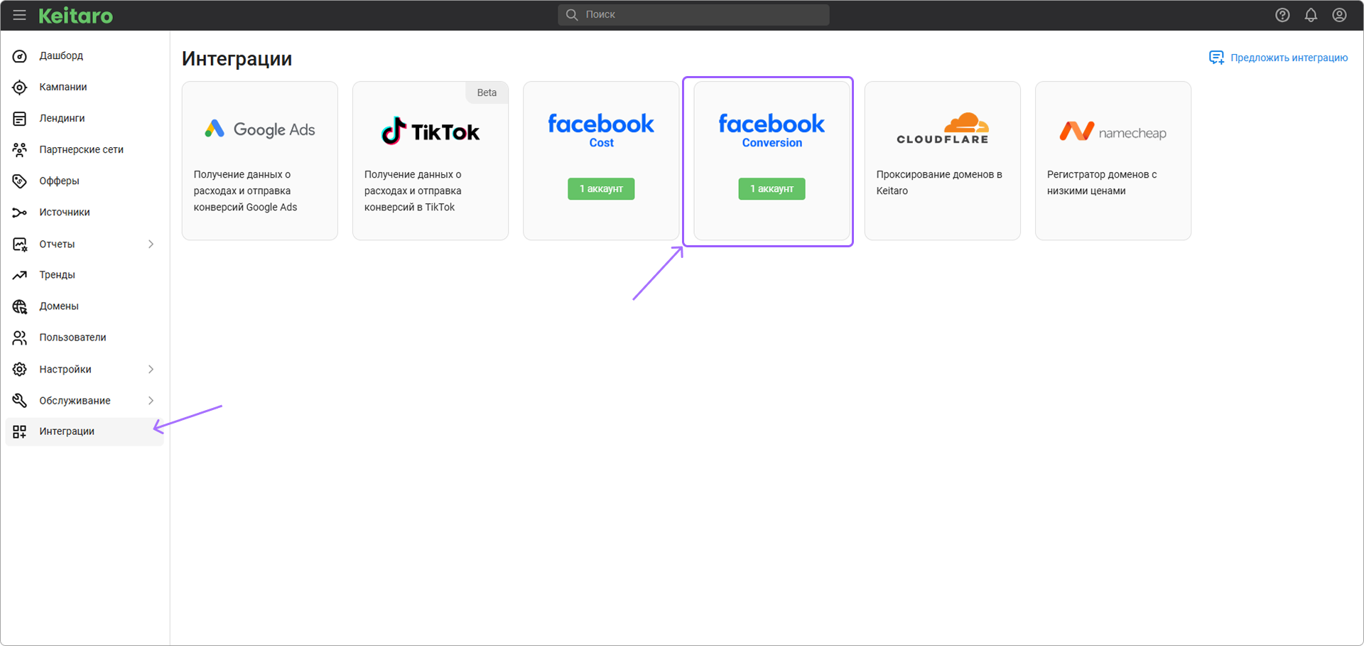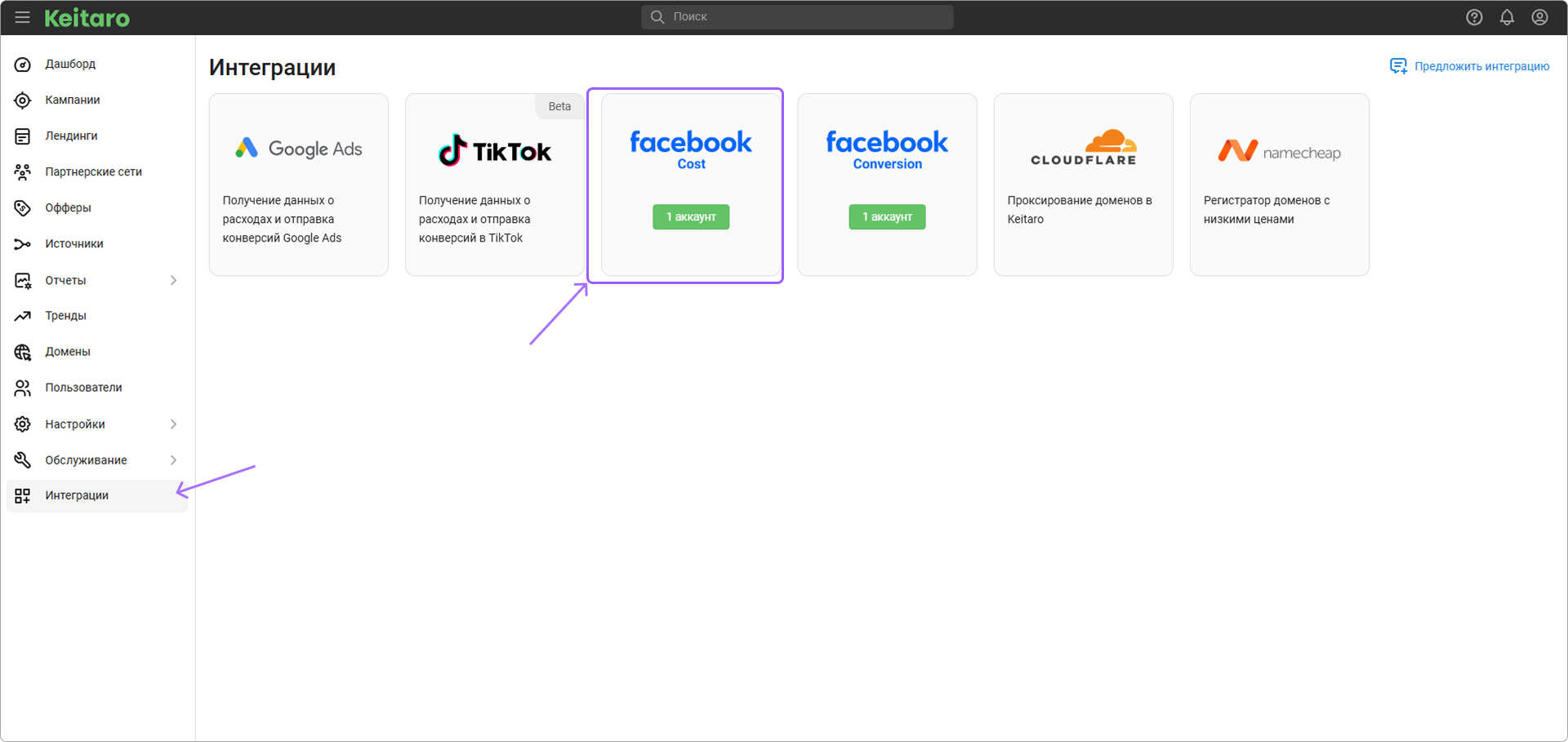 Откройте Интеграции, выберите интеграцию Facebook cost:
